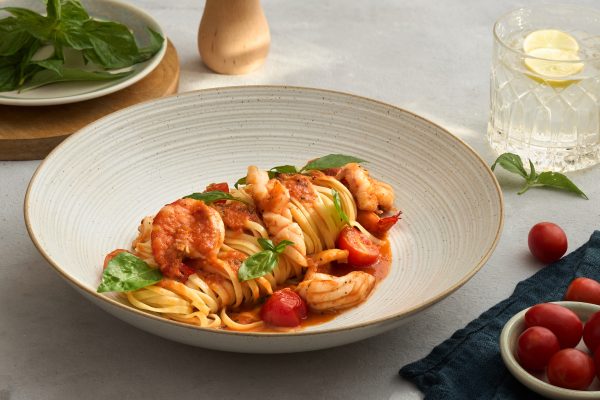 Olive oil and parsley spaghetti topped with lemon-scented pan-fried mixed seafood and Miso